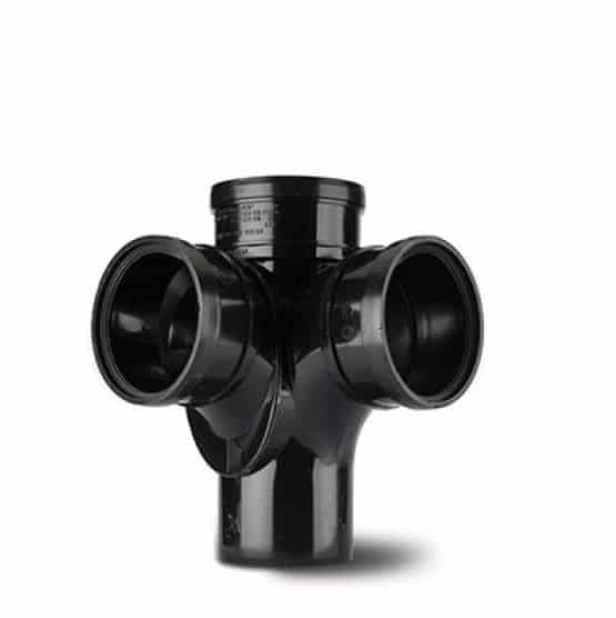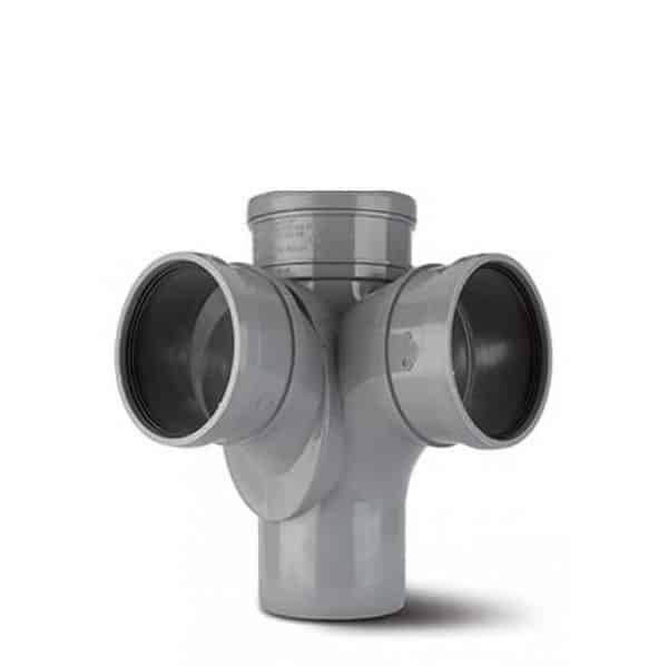 The 110mm Corner Branch 87.5° features a double socket design, allowing pipe to be connected at both ends, with a branch outlet positioned to suit corner installations.