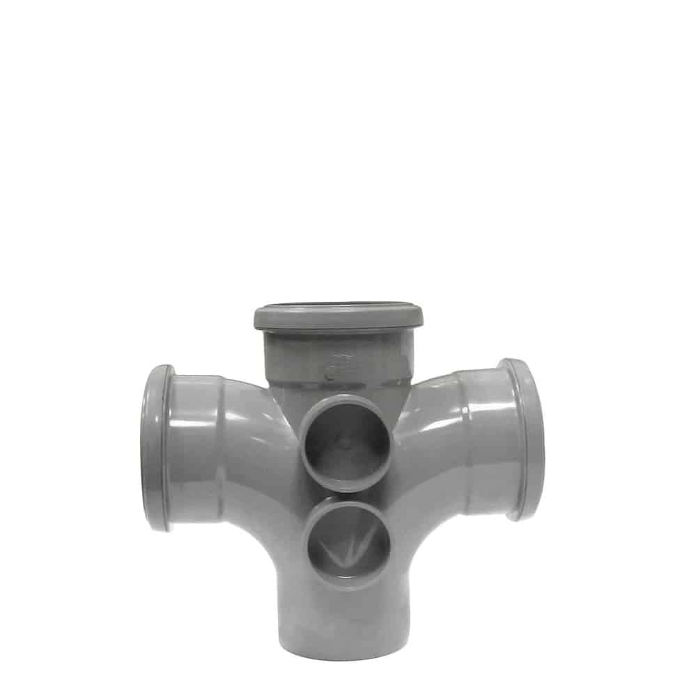 This 110mm Cross Tee Branch is designed to connect multiple branch pipes into a 110mm soil pipe system, allowing efficient distribution of waste flow.