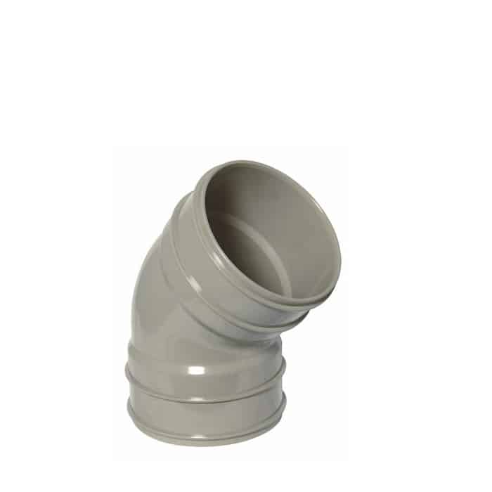 110mm solvent weld bend 45° double socket. Provides smooth direction changes with a permanent joint installation. Available in black and olive grey.